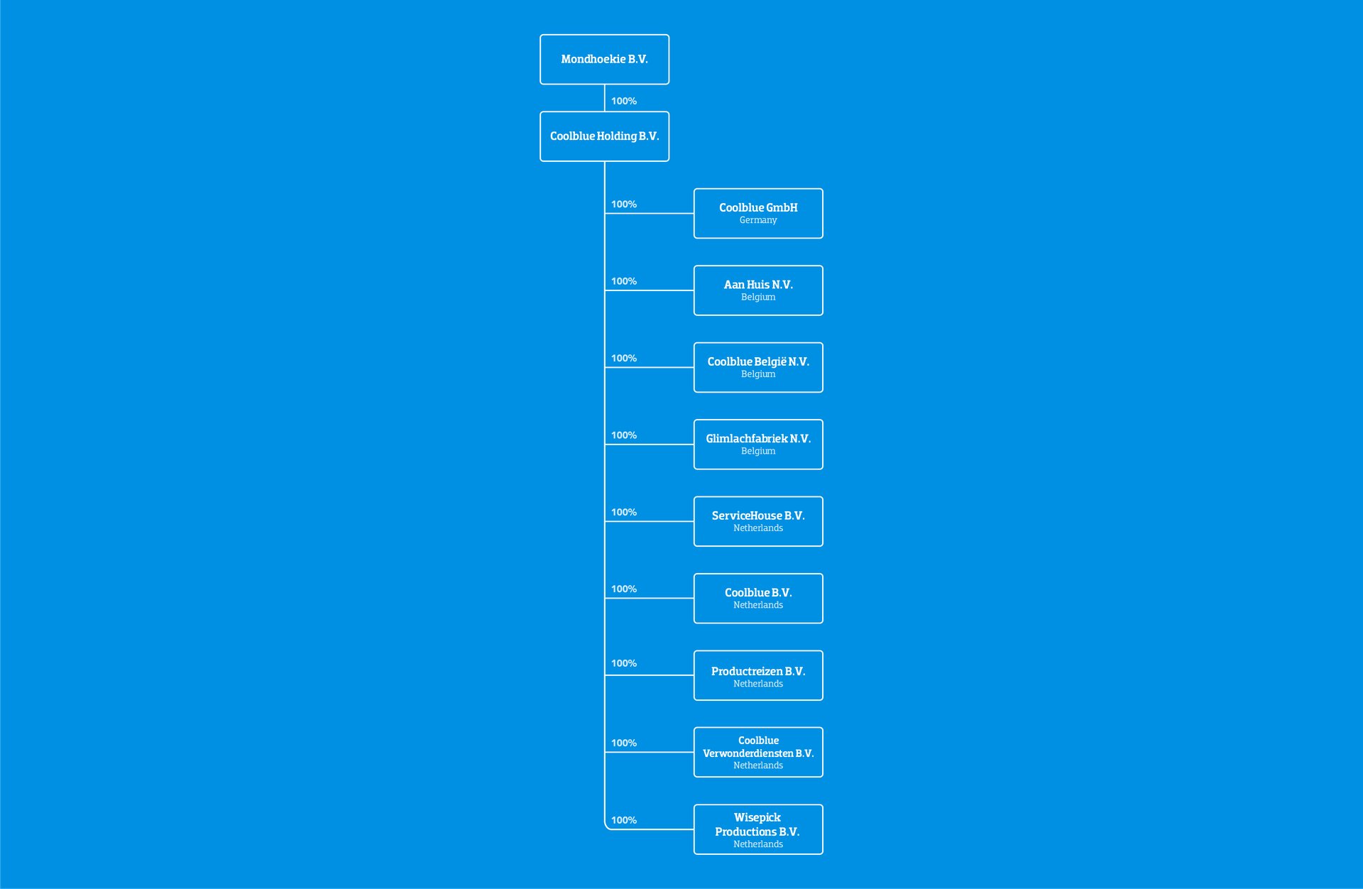 We keep our corporate structure as simple as possible. We are active in the Netherlands, Belgium, and Germany via various corporate entities. They are all fully owned by Coolblue Holding B.V., a private company with limited liability (besloten vennootschap) under Dutch law, which in turn is fully owned by Mondhoekie B.V. In 2025, a transaction took place in which we fully sold Windcentrale B.V., a part of Servicehouse B.V. involved in the management of windmill cooperatives.